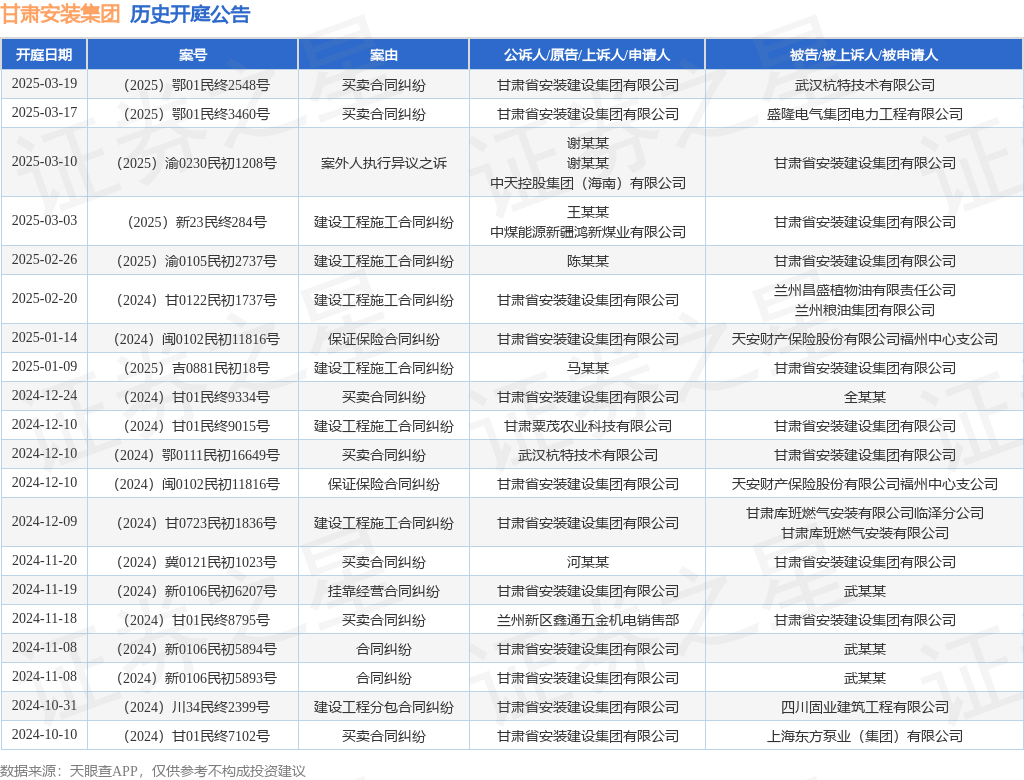 本站消息,根据天眼查APP显示,近日公布了一则甘肃省安装建设集团有限公司作为被告/被上诉人的开庭公告,详细内容如下: